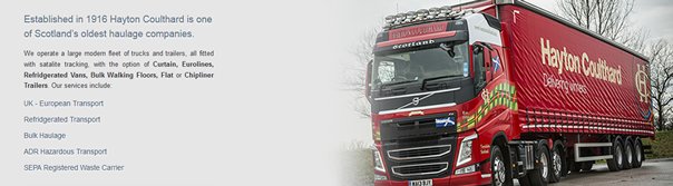 Established in 1916, Hayton Coulthard is one of Scotlands oldest haulage companies. We operate a large modern fleet of trucks and trailers, all fitted with satalite tracking, with the option of curtain - euroliners - refridgerated vans - bulk walking floors - flat or chipliner trailers.